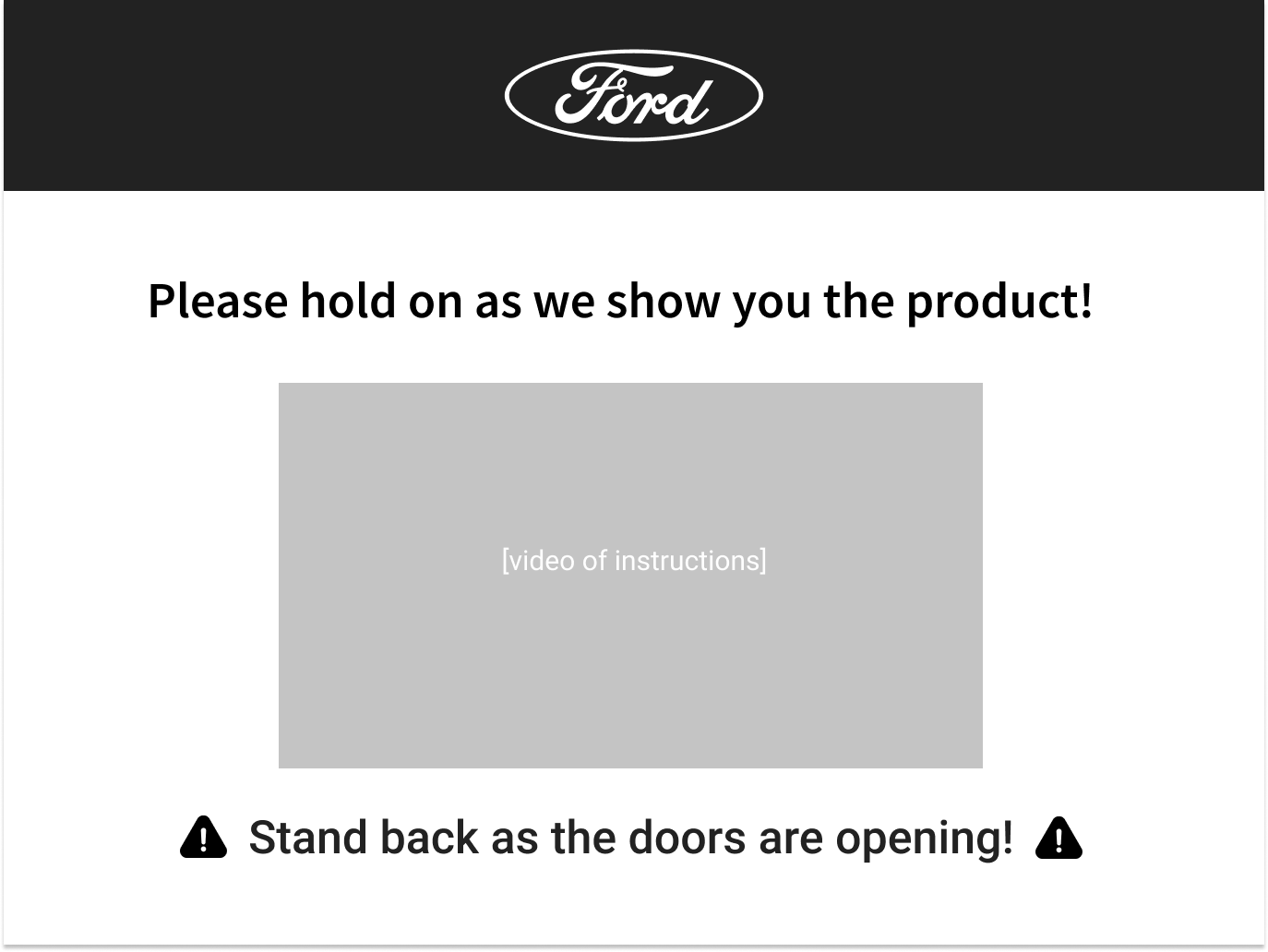 Screens that show up specifically for the product testing service. The screens follow the car door opening warning screen for users to grab the item they are intending to test.