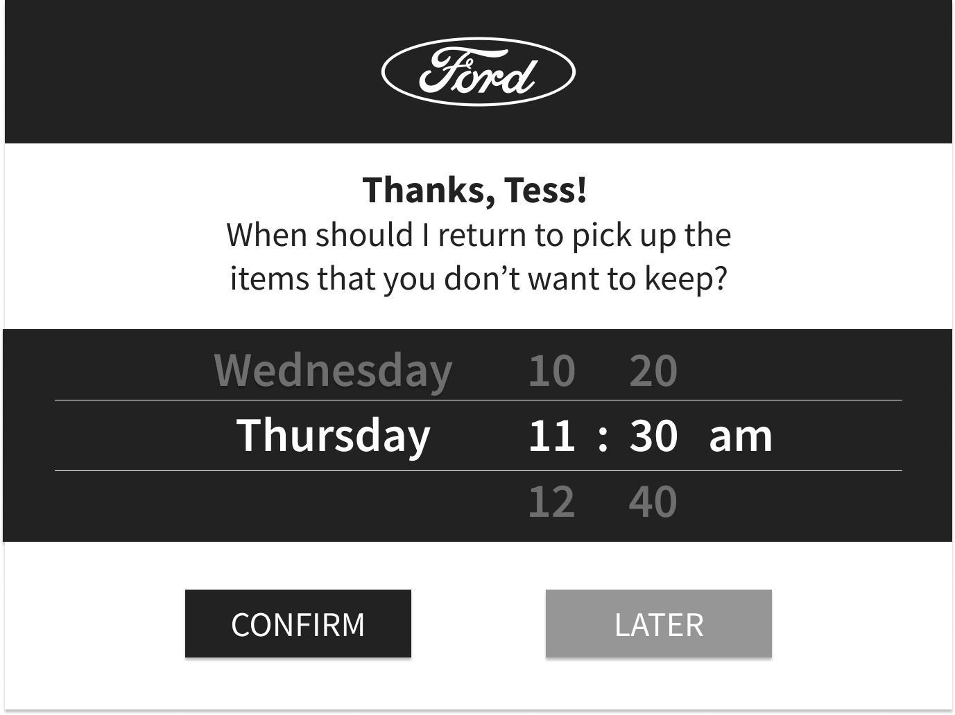 We presented our findings to a team of designers and engineers at Ford. The clients were very pleased with our research results and specific concepts. They found that our results of returns, convenience, and product testing were very eye-opening, and something they realized they hadn’t explored or scoped out.
