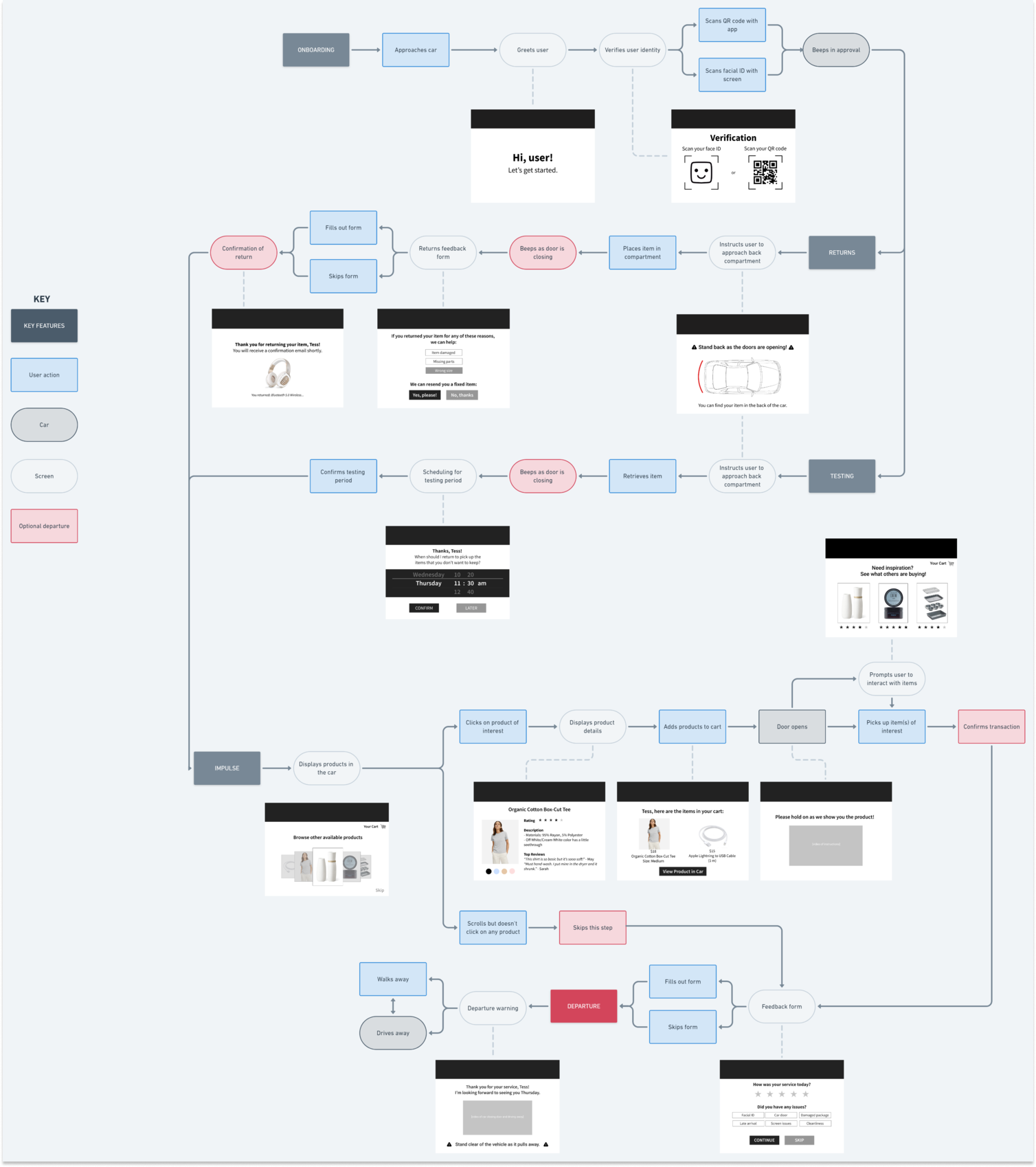 We created a general flow of our three services that incorporated our prototypes and mapped out the all of the micro-moments users would have when interacting with the car.